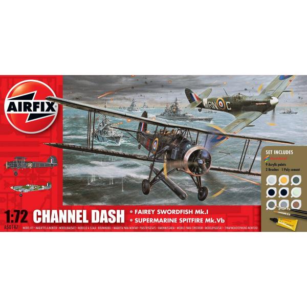 COFFRET CADEAU "LES DEFENSEURS DE LA MANCHE" - Fairey Swordfish Mk.1 & Supermarine Spitfire Mk.Vb. Le coffret comprend: les deux maquettes d’avions de l'armée Britannique + 9 pots de peinture + 2 pinceaux et 1 tube colle.